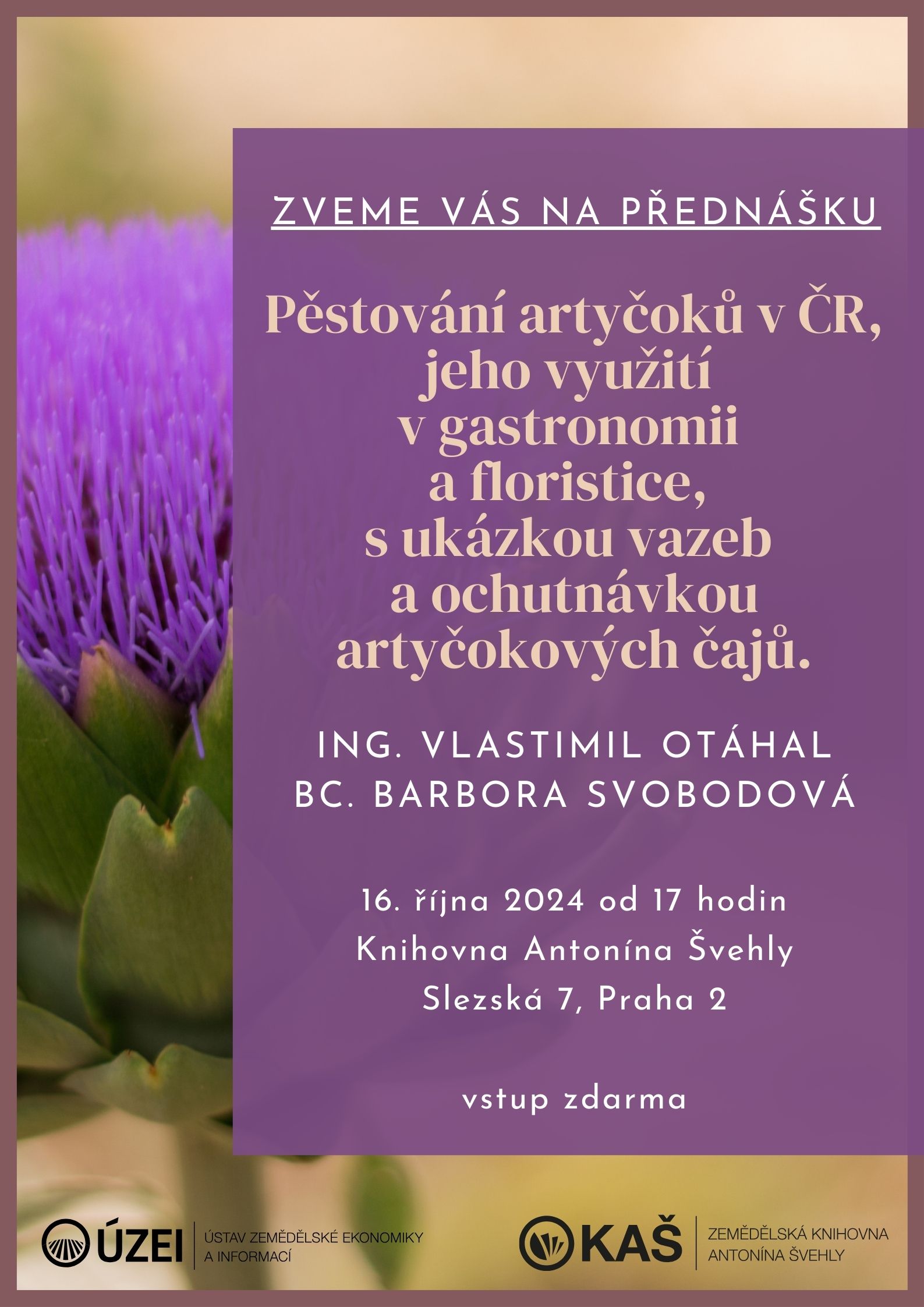 Zveme vás na přednášku o pěstování artyčoku v České republice, jaké má využití v gastronomii, jaké jsou zdravotní přínosy této netradiční zeleniny, ale také to, jak krásná je, když se použije ve floristice. Součástí přednášky bude degustace čaje z artyčoku, dále si pak budete moci prohlédnout ukázku květinové vazby.