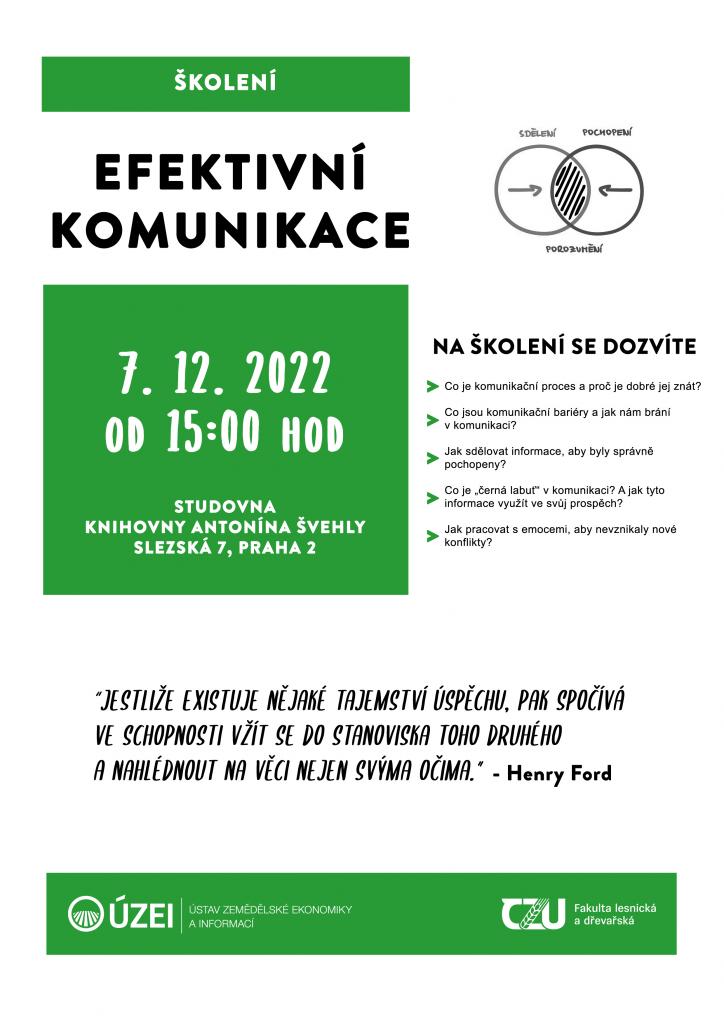 Dovolujeme si Vás pozvat na školení Efektivní komunikace, které pořádá Ústav zemědělské ekonomiky a informací ve spolupráci s Fakultou lesnickou a dřevařskou ČZU.