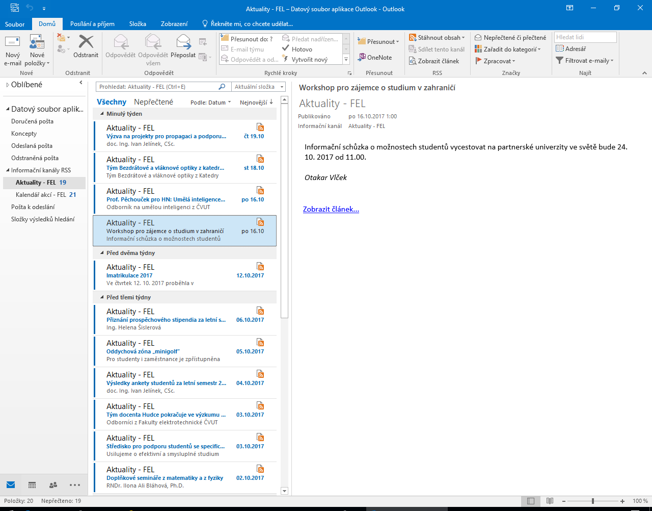 V Outlooku klikněte pravým tlačítkem na složku “Informační kanály RSS” a vyberte “Přidat nový informační kanál RSS”.
