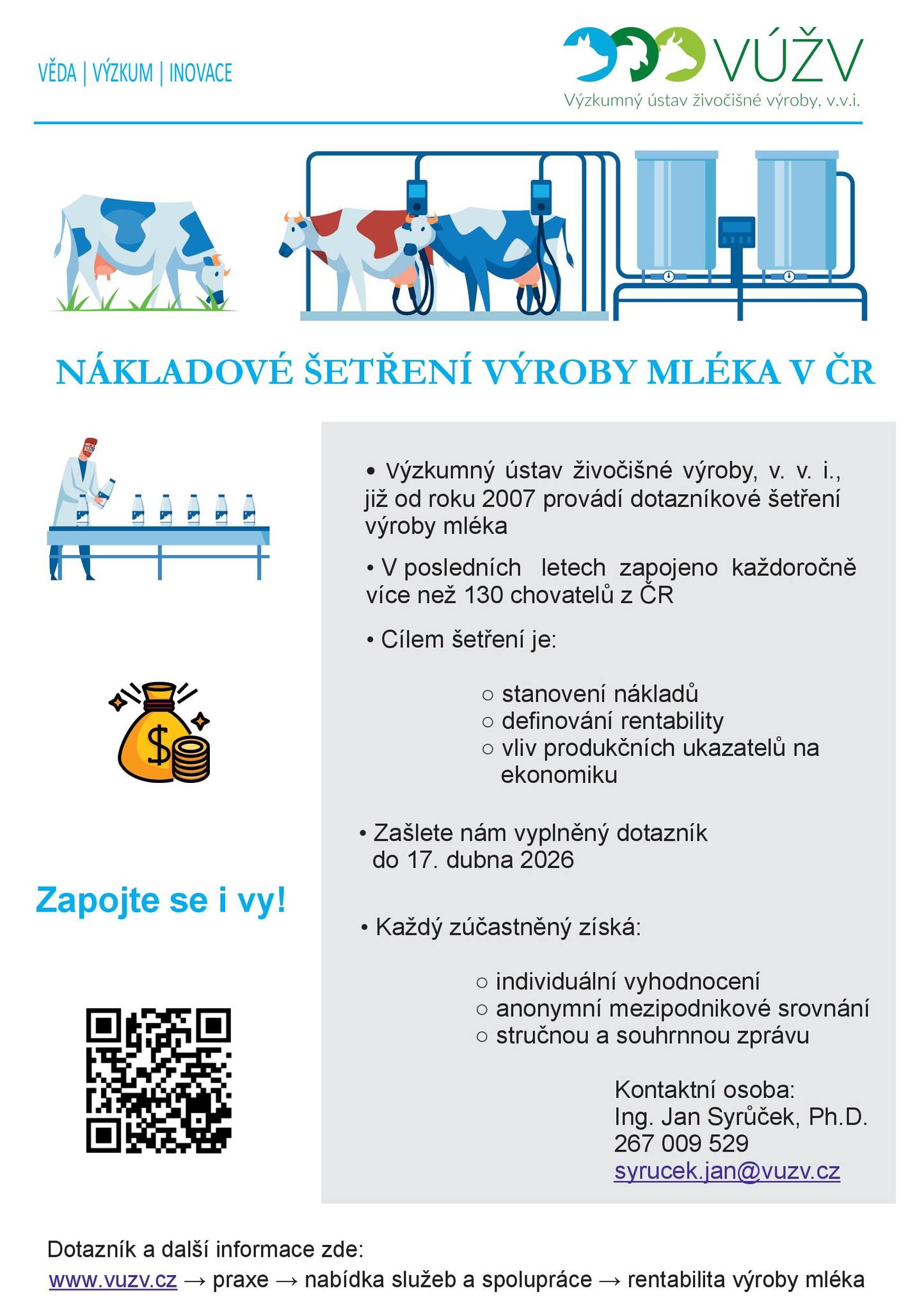 Aktuálně probíhá výzva k zapojení zemědělských podniků do nákladového šetření výroby mléka. Výzkumný ústav živočišné výroby, v. v. i., se dlouhodobě věnuje sledování a vyhodnocování rentability výroby mléka v České republice. Od roku 2007 shromažďuje prostřednictvím dotazníků údaje od chovatelů dojených krav a ty následně zpracovává. V posledních letech se výzkumu každoročně účastní více než 130 chovatelů z různých oblastí ČR.