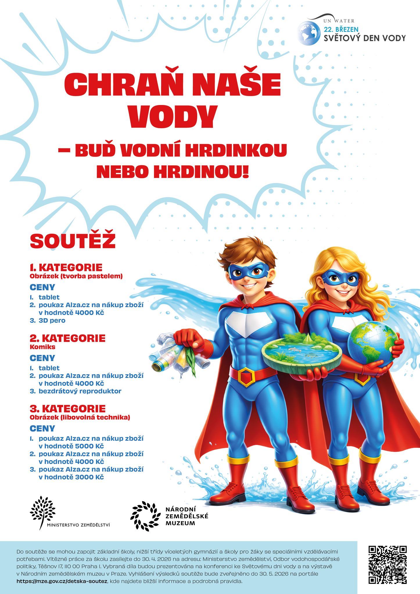 U příležitosti Světového dne vody 2026, který připadá na 22. března, vyhlásilo Ministerstvo zemědělství výtvarnou soutěž „Chraň naše vody – buď vodní hrdinkou nebo hrdinou“. Jejím cílem je vést žáky k zamyšlení nad tím, jakou roli hraje voda v našem každodenním životě – proč je nenahraditelná, jak ji využíváme a jak můžeme společně chránit vodní zdroje, aby zůstaly čisté a dostupné.